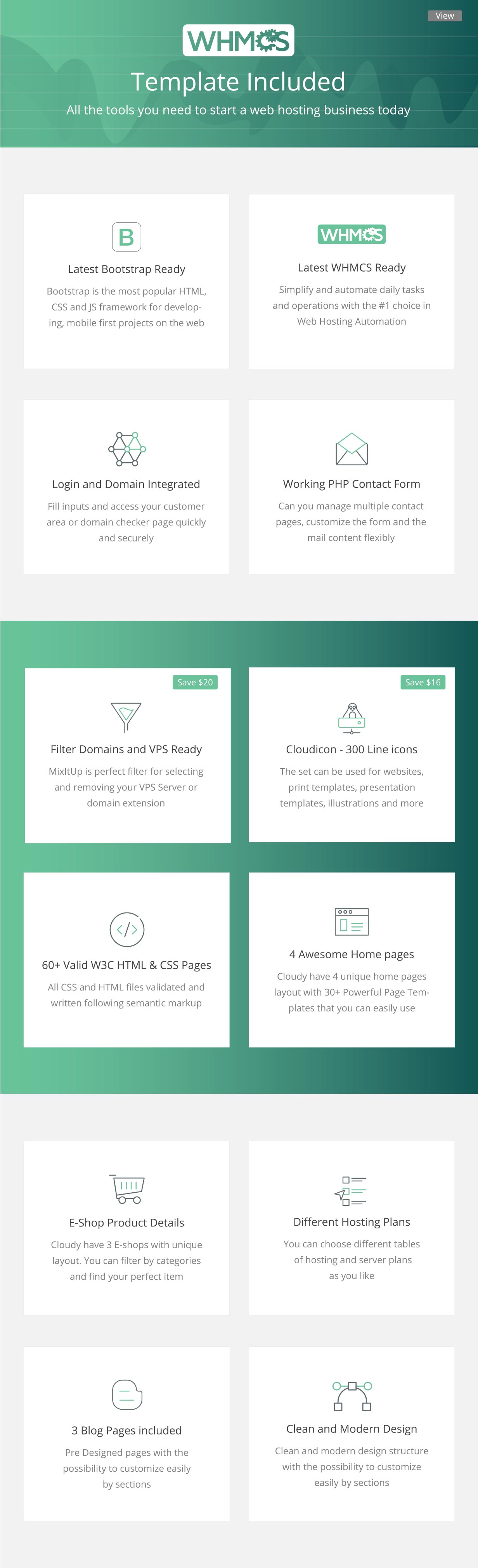 Cloudy Template included Latest WHMCS Responsive Template designed for all kinds of Domain, Cloud Servers and Hosting Business. Now, customise your template and run project. Good luck!
