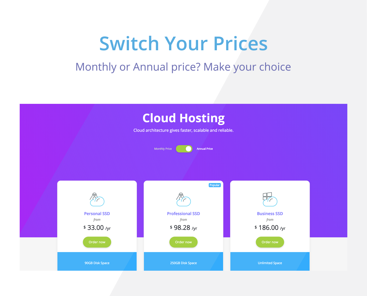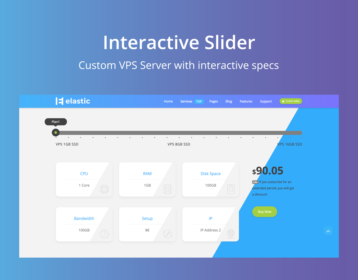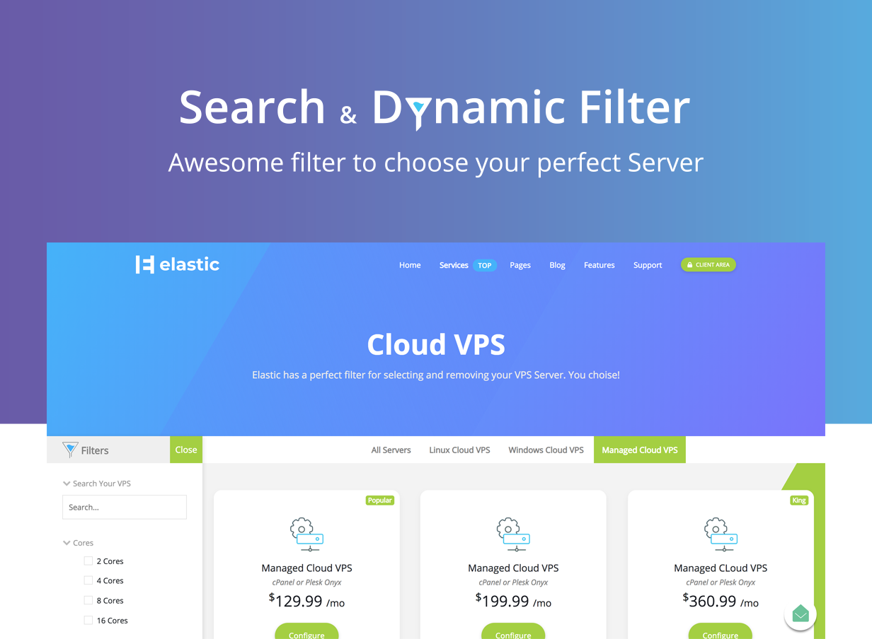 Elastic are a professional and modern template with a splash of color. It uses the latest technology HTML5 and CSS3 based on the Bootstrap Framework. Comes with 20+ powerful page templates, and 30+ custom shortcode elements with special reference to the professional Filter of VPS and Domains – Switch prices dynamically – And customize servers according to your needs.